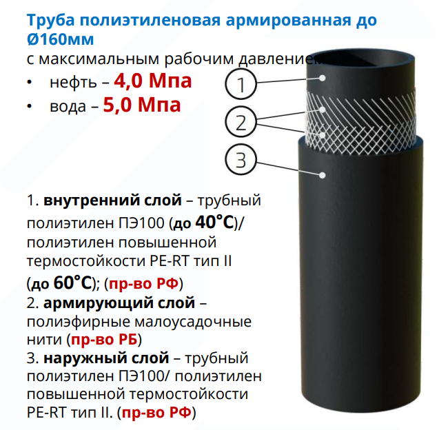 Труба АНАКОНДА 65 66/90 РЕ-RТ /ПЭТВ/ РЕ-RТ Каталог Конструкция трубы Сертификат Гибкая армированная труба АНАКОНДА 65 66/90 РЕ-RТ /ПЭТВ/ РЕ-RТ для транспортировки нефти, воды и газа с типоразмером 66/90. Технические характеристики: Артикул АНАКОНДА 65 66/90 РЕ-RТ /ПЭТВ/ РЕ-RТ Производитель Технология Композитов Типоразмер 66/90 Макс. рабочая температура, °С 60 Максимальное рабочее давление, МПа 5,0 (для воды) DN/OD (номинальный наружный диаметр трубы), мм 90 Типоразмер напорной трубы 66 Материал напорной трубы полиэтилен повышенной термостойкости PE-RT тип II Типоразмер защитной оболочки 90 Материал защитной оболочки полиэтилен повышенной термостойкости PE-RT тип II Соответствие ГОСТ ГОСТ Р 59834 Страна производства Россия Показать больше характеристик: 3194 под заказ Количество Купить Добавить к сравнению Труба АНАКОНДА 65 66/90 РЕ-RТ /ПЭТВ/ РЕ-RТ Гибкая армированная труба АНАКОНДА 65 66/90 РЕ-RТ /ПЭТВ/ РЕ-RТ применяется для транспортировки нефти, воды или газа в следующих областях: - Подземные нефтепромысловые трубопроводы, транспортирующие сырую и очищенную нефть, многофазные смеси и эмульсии, попутный нефтяной газ, под давлением до 4,0 Мпа; - Водоводы, транспортирующие высокоминерализованную пластовую, сточную и хозяйственнопитьевую воды, под давлением до 5,5 Мпа; - Водоводы искусственного оснежения лыжных трасс с давлением 5,5 Мпа; - Межпоселковые газопроводы под давлением до 1,2 МПа. Трубы предназначены для эксплуатации при температуре транспортируемой среды до +60°С (в исполнении РЕ-RТ). Конструкция трубы Трубы Anaconda представляют собой гладкостенную многослойную конструкцию, состоящую из последовательности слоев полиэтилена трубных марок и силовых армирующих слоев. Внутренний слой – полиэтилен повышенной термостойкости PE-RT тип II; Армирующий слой – полиэфирные малоусадочные нити; Наружный слой – полиэтилен повышенной термостойкости PE-RT тип II. Размерные характеристики Масса, кг/м 2,72 < Транспортировочные характеристики Стандартная длина трубы в бухте, м 300 Стандартная высота бухты, м 2,32 Способы оплаты Доставка Гарантия и возврат 1. Оплата наличными для физических лиц при получении (для Москвы и МО при доставке курьерами G-Lights.RU или самовывозе (по некоторым товарам "под заказ" может потребоваться предоплата). 2. Оплата банковской картой в офисе (только при самовывозе) 3. Безналичный перевод для физических лиц (оплата по реквизитам банковским переводом) 4. Оплата картой на сайте при оформлении заказа или по ссылке на оплату картой, отправленной нашими менеджерами после согласования условий заказа 5. Безналичная оплата для юридических лиц по счету. Подробнее с информацией о способах оплаты вы можете ознакомиться в соответствующем разделе нашего сайта: Способы оплаты 1. Самовывоз из офиса "МДА Лайтс". 140008, Люберцы, ул. 3-е почтовое отделение, 82. Подробнее в разделе Контакты 2. Курьерская доставка по Москве (в пределах МКАД, общая масса заказа не более 7 кг) - 389 рублей. 3. Автодоставка по Москве (в пределах МКАД, общая масса заказа свыше 7 кг) - 1000 рублей 4. Доставка по Московской области - 1500 рублей в пределах МБК, за пределами МБК - стоимость согласовывается индивидуально 5. Доставка по России. Осуществляется транспортными/курьерскими компаниями по тарифам перевозчика. Доставка до терминалов ТК "Деловые Линии" и ПВЗ СДЭК в городе Москва осуществляется бесплатно. ВНИМАНИЕ: В зависимости 