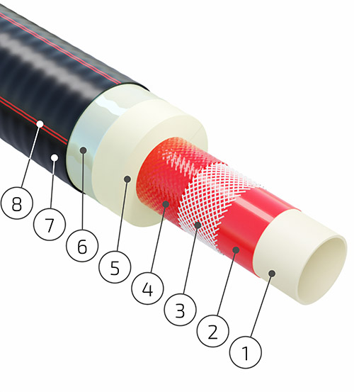 Труба КОРДФЛЕКС 160/270 ПЛЮС Р 1,6 МПа 130°C Конструкция трубы Сертификат Гибкая полимерная теплоизолированная труба с типоразмером напорной трубы 160 и типоразмером защитной оболочки 270, рассчитанная на рабочее давление 1,6 МПа при переменной температуре до 130°С:. Технические характеристики: Артикул КОРДФЛЕКС 160/270 ПЛЮС Р 1,6 МПа 130°C Производитель Полимертепло Типоразмер 160/270 Макс. рабочая температура, °С 130 Максимальное рабочее давление, МПа 1,6 Типоразмер напорной трубы 160 Материал напорной трубы PE-Xa Цвет напорной трубы красный Типоразмер защитной оболочки 270 Материал защитной оболочки ПЭ Цвет защитной оболочки черный/красный Соответствие ГОСТ ГОСТ Р 54468-2011 Теплоизоляция ППУ Страна производства Россия Показать больше характеристик: По запросу под заказ Количество Купить Добавить к сравнению Труба КОРДФЛЕКС 160/270 ПЛЮС Р 1,6 МПа 130°C Трубы КОРДФЛЕКС 160/270 ПЛЮС Р 1,6 МПа 130°C— используются для высокотемпературных систем теплоснабжения с максимальным рабочим давлением 1,6 МПа и расчетным температурным графиком качественного регулирования отпуска тепла 130°С – 70°С. Область применения Трубы КОРДФЛЕКС 160/270 ПЛЮС Р 1,6 МПа 130°C используются для создания новых и реконструкции существующих трубопроводов. При создании трубопроводов в основном применяется метод бесканальной подземной прокладки, а также прокладки в проходных и непроходных каналах. Конструкция и физические характеристики материалов, из которых изготовлены трубы, обеспечивают им значительную гибкость. Это позволяет создавать трубопроводы любой сложности практически без использования дополнительных фасонных изделий. Благодаря гибкости труб, можно выбрать оптимальный маршрут теплотрассы и плавно обходить препятствия в условиях плотной городской застройки, такие как строения, коммуникации и отдельно стоящие деревья. Физические свойства труб позволяют производить укладку без учета их теплового расширения; при прокладке не требуется устройство компенсаторов, отводов и неподвижных опор. Конструкция труб Конструкция труб КОРДФЛЕКС представляет собой классическую конструкцию гибких предизолированных труб и состоит из многослойной армированной напорной трубы, теплоизоляционного слоя из пенополиуретана и гофрированной защитной оболочки из полиэтилена. 1. Тонкостенная труба из высокотемпературных полимеров 2. Высокотемпературный адгезив 3. Армирующие нити из высокомодульного волокна 4. Наружный слой напорной трубы 5. Слой теплоизоляции (полужесткий пенополиуретан) 6. Барьерный слой 7. Защитная оболочка из полиэтилена 8. Идентификационные полосы красного цвета При разработке трубы КОРДФЛЕКС были исследованы и испытаны специальные марки конструкционных термопластов, разработаны собственные адгезивы и термостойкие композиции полимеров, способные выдерживать высокие температуры при длительной эксплуатации. Для переработки таких материалов разработан дизайн пятислойной напорной трубы, а конструкторским отделом АО «Завода АНД Газтрубпласт» спроектирована технологическая оснастка для многослойной экструзии. Для повышения энергоэффективности трубопровода в теплоизоляционном слое применен вспенивающий агент последнего поколения, что позволяет снизить тепловые потери при высокотемпературной эксплуатации. Трубы КОРДФЛЕКС поставляются на строительную площадку дли