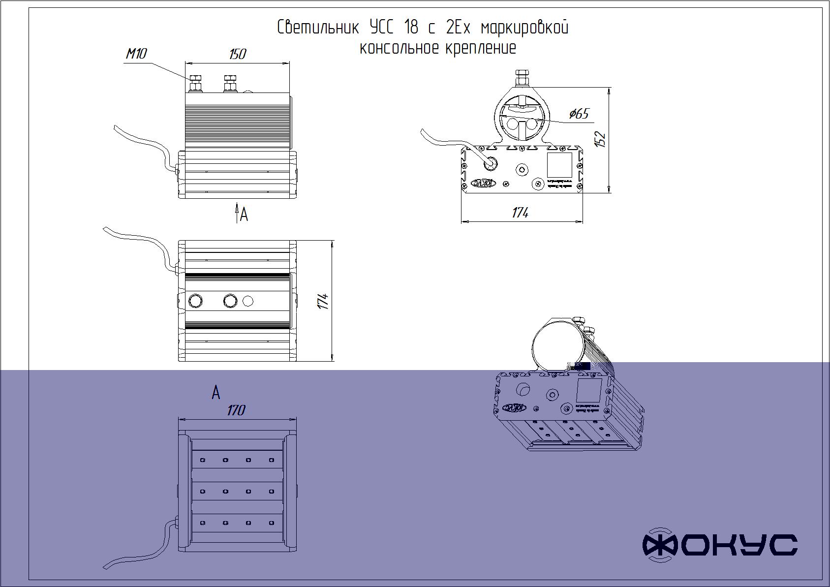 Светодиодный светильник УСС 18 2Ex (консольное крепление) Паспорт Кривая силы света IES-файл Сертификат Чертеж Взрывозащищённый уличный светодиодный светильник УСС 18 2Ex. Потребляемая мощность - 22 Вт, световой поток - 2600 Лм, габариты - 174*170*152 мм, цвет свечения - 4000K, гарантия - 3 года. Технические характеристики: Производитель Фокус Артикул УСС 18 2Ex (консольное крепление) УСС 18 2Ex (потолочное крепление) УСС 18 2Ex (скоба) УСС 18 2Ex (трос) Питающее напряжение, В / диапазон частот Гц AC 170-264 / DC 200-370 / 50-60 Потребляемая мощность, Вт 22 Степень защиты, IP 67 Цвет свечения, К 4000K Габаритные размеры светильника, ВШГ, мм 174*170*152 мм, Масса светильника, нетто, кг 2.7 Световой поток, лм 2600 Тип крепления консольный Страна происхождения Россия Гарантия 3 года Показать больше характеристик: Выберите нужные параметры: 10800 руб. под заказ Количество Купить Добавить к сравнению Светодиодный светильник УСС 18 2Ex (консольное крепление) Светильник УСС 18 взрывозащищенный предназначен для освещения объектов с уровнем взрывозащиты не выше 2Ex nR IIС T6 Gc X и Ex tb IIIC T80°C Db X. Потребляемая мощность от сети переменного тока 220 Вольт— 22Вт. Является заменой светильников РКУ, РСП, СВЛ, НПП, НСП с использованием ртутных ламп ДРЛ-250. Незаменим в местах, где требуется экономия электроэнергии и очень высокая надежность. Уровень взрывозащиты 2Ex nR IIС T6 Gc X и Ex tb IIIC T80°C Db X. У светильника УСС 18 отсутствует стробоскопический эффект, сила света не меняется во всем диапазоне питающих напряжений. Время выхода нарежим менее 1 секунды. Для увеличения надежности светильник разделен на электрически независимые части и имеет независимые системы термостатирования. Также драйверы светодиодов оснащены запатентованной электронной системой защиты от превышения напряжения до 800 Вольт. Корпус выполнен из анодированного алюминиевого профиля со стеклом из противоударного оптического поликарбоната. Весь крепеж выполняется из нержавеющей стали. Светильник крепится на любые консоли с посадочным диаметром трубы до 65 мм. Доступны крепления на трос, потолок и для встраивания в подвесные потолки. Для обеспечения дополнительной экономии и автоматизации светильники могут быть оснащены датчиками освещенности. Данные датчики встраиваются в светильник и обеспечивают автоматическое включение/выключение светильника при заходе/восходе солнца. Функция датчика освещенности особенно актуальна для частных лиц, а также на линиях электропередач, на которых отсутствует линия для освещения. Светильники серии УСС отличают: высокая светоотдача; бесшумность во время работы; отсутствие стробоскопического эффекта и вибрации; стабильность силы света во всем диапазоне питающих напряжений; устойчивость к вибрации и вандализму; широкий диапазон рабочих температур и питающих напряжений; мгновенное включение даже при глубоких отрицательных температурах; срок службы более 20 лет. Выпускается с двумя типами рассеивателей - прозрачным и матовым. С прозрачным стеклом световой поток составляет 2600 лм, с матовым - 1820 лм. Дополнительные характеристики Источник света LED Материал корпуса алюминий Материал рассеивателя поликарбонат Тип кривой силы света (КСС)/угол раскрытия луча Д Потребляемый ток светильника не более, А 0,15 Класс защиты от поражения электрическим током I Индекс цветопередачи Ra > 70 Диапазон рабочих температур, ºС -60... +45 Вид климатич