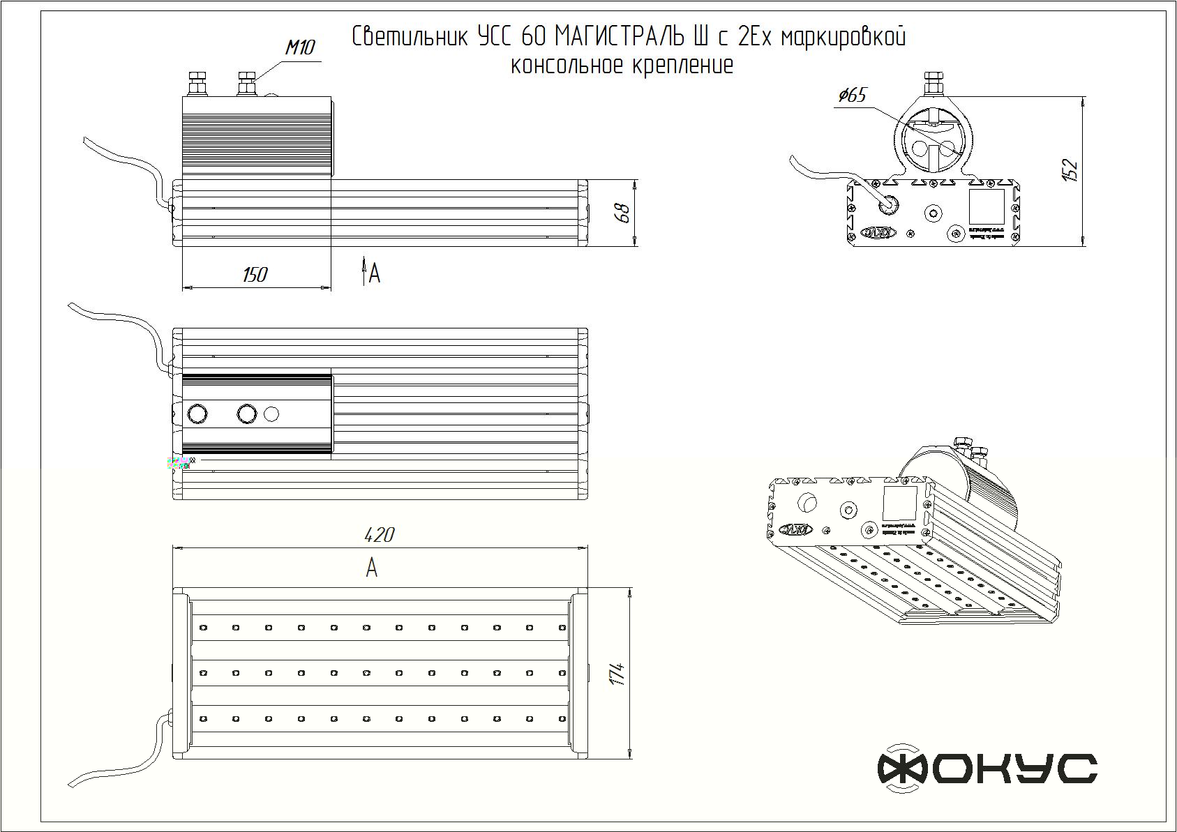 Светодиодный светильник УСС 65 Магистраль Ш1-2 2Ex (консольное крепление) Паспорт Кривая силы света IES-файл Сертификат Чертеж Взрывозащищённый светодиодный светильник УСС 65 Магистраль Ш1-2 2Ex. Потребляемая мощность - 60 Вт, световой поток - 5400 Лм, габариты - 420*174*152 мм, цвет свечения - 5000K, гарантия - 3 года. Технические характеристики: Производитель Фокус Артикул УСС 65 Магистраль Ш1-2 2Ex (консольное крепление) УСС 65 Магистраль Ш1-2 2Ex (трос) УСС 65 Магистраль Ш1-2 2Ex (скоба) Питающее напряжение, В / диапазон частот Гц AC 170-264 / DC 200-370 / 50-60 Потребляемая мощность, Вт 60 Степень защиты, IP 67 Цвет свечения, К 5000K Габаритные размеры светильника, ВШГ, мм 420*174*152 мм, Масса светильника, нетто, кг 4.7 Световой поток, лм 5400 Тип крепления консольный Страна происхождения Россия Гарантия 3 года Показать больше характеристик: Выберите нужные параметры: 19500 руб. под заказ Количество Купить Добавить к сравнению Светодиодный светильник УСС 65 Магистраль Ш1-2 2Ex (консольное крепление) Светодиоды разработаны эксклюзивно компанией Nichia для ФОКУС. Светильник УСС 60 МАГИСТРАЛЬ Ш взрывозащищенный предназначен для освещения объектов с уровнем взрывозащиты не выше 2Ex nR IIС T6 Gc X и Ex tb IIIC T80°C Db X. Потребляемая мощность от сети переменного тока 220 Вольт— 60Вт. Является заменой светильников РКУ, РСП, СВЛ, НПП, НСП с использованием ртутных ламп ДРЛ-250. Незаменим в местах, где требуется экономия электроэнергии и очень высокая надежность. Уровень взрывозащиты 2Ex nR IIС T6 Gc X и Ex tb IIIC T80°C Db X. У светильника отсутствует стробоскопический эффект, сила света не меняется во всем диапазоне питающих напряжений. Время выхода нарежим менее 1 секунды. УСС-60 МАГИСТРАЛЬ Ш выполнен на основе светодиодов японской компании NICHIA. Светильники производятся на основе светодиодов со светоотдачей 120 лм/Вт. Для увеличения надежности светильник разделен на электрически независимые части и имеет независимые системы термостатирования. Также драйверы светодиодов оснащены запатентованной электронной системой защиты от превышения напряжения до 800 Вольт. Корпус выполнен из анодированного алюминиевого профиля со стеклом из противоударного оптического поликарбоната. Весь крепеж выполняется из нержавеющей стали. Светильник крепится на любые консоли с посадочным диаметром трубы до 65 мм. Доступны крепления на трос, потолок и для встраивания в подвесные потолки. Для обеспечения дополнительной экономии и автоматизации светильники могут быть оснащены датчиками освещенности. Данные датчики встраиваются в светильник и обеспечивают автоматическое включение/выключение светильника при заходе/восходе солнца. Функция датчика освещенности особенно актуальна для частных лиц, а также на линиях электропередач, на которых отсутствует линия для освещения. Светильники серии УСС отличают: высокая светоотдача; бесшумность во время работы; отсутствие стробоскопического эффекта и вибрации; стабильность силы света во всем диапазоне питающих напряжений; устойчивость к вибрации и вандализму; широкий диапазон рабочих температур и питающих напряжений; мгновенное включение даже при глубоких отрицательных температурах; срок службы более 20 лет. Дополнительные характеристики Источник света LED Материал корпуса алюминий Материал рассеивателя поликарбонат Тип кривой силы света (КСС)/угол раскрытия луча Ш Производитель светодиодов Nichia Потребля