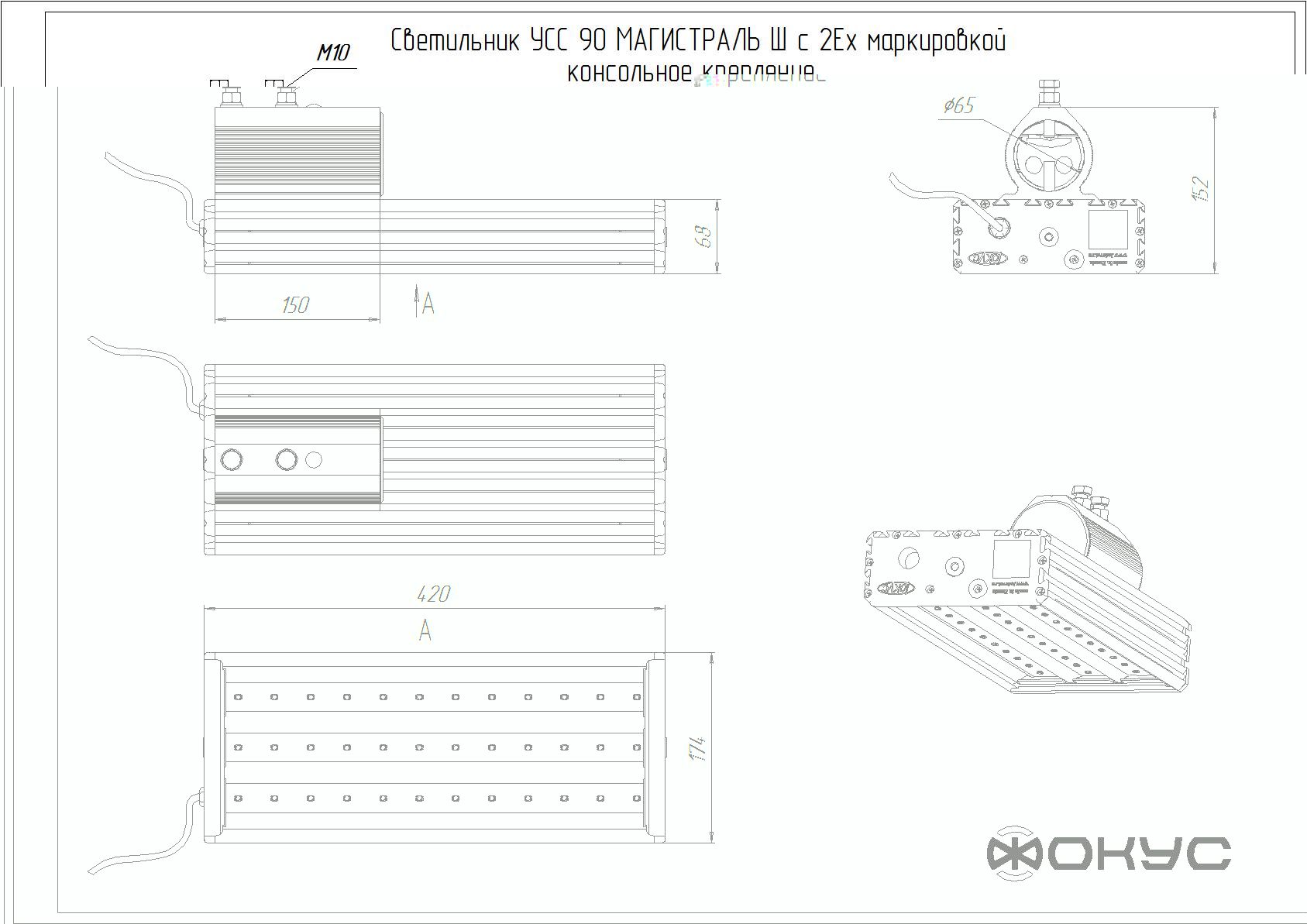 Светодиодный светильник УСС 90 Магистраль Ш1-2 2Ex (консольное крепление) Паспорт Кривая силы света IES-файл Сертификат Чертеж Взрывозащищённый светодиодный светильник УСС 90 Магистраль Ш1-2 2Ex. Потребляемая мощность - 90 Вт, световой поток - 8100 Лм, габариты - 420*174*152 мм, цвет свечения - 5000K, гарантия - 3 года. Технические характеристики: Производитель Фокус Артикул УСС 90 Магистраль Ш1-2 2Ex (консольное крепление) УСС 90 Магистраль Ш1-2 2Ex (трос) УСС 90 Магистраль Ш1-2 2Ex (скоба) Питающее напряжение, В / диапазон частот Гц AC 170-264 / DC 200-370 / 50-60 Потребляемая мощность, Вт 90 Степень защиты, IP 67 Цвет свечения, К 5000K Габаритные размеры светильника, ВШГ, мм 420*174*152 мм, Масса светильника, нетто, кг 4.7 Световой поток, лм 8100 Тип крепления консольный Страна происхождения Россия Гарантия 3 года Показать больше характеристик: Выберите нужные параметры: 23196 руб. под заказ Количество Купить Добавить к сравнению Светодиодный светильник УСС 90 Магистраль Ш1-2 2Ex (консольное крепление) Светодиоды разработаны эксклюзивно компанией Nichia для ФОКУС. Светильник УСС 90 МАГИСТРАЛЬ Ш взрывозащищенный предназначен для освещения объектов с уровнем взрывозащиты не выше 2Ex nR IIС T6 Gc X и Ex tb IIIC T80°C Db X. Потребляемая мощность от сети переменного тока 220 Вольт— 90Вт. Является заменой светильников РКУ, РСП, СВЛ, НПП, НСП с использованием ртутных ламп ДРЛ-250. Незаменим в местах, где требуется экономия электроэнергии и очень высокая надежность. Уровень взрывозащиты 2Ex nR IIС T6 Gc X и Ex tb IIIC T80°C Db X. У светильника отсутствует стробоскопический эффект, сила света не меняется во всем диапазоне питающих напряжений. Время выхода нарежим менее 1 секунды. УСС 90 МАГИСТРАЛЬ Ш выполнен на основе светодиодов японской компании NICHIA. Светильники производятся на основе светодиодов со светоотдачей 120 лм/Вт. Для увеличения надежности светильник разделен на электрически независимые части и имеет независимые системы термостатирования. Также драйверы светодиодов оснащены запатентованной электронной системой защиты от превышения напряжения до 800 Вольт. Корпус выполнен из анодированного алюминиевого профиля со стеклом из противоударного оптического поликарбоната. Весь крепеж выполняется из нержавеющей стали. Светильник крепится на любые консоли с посадочным диаметром трубы до 65 мм. Доступны крепления на трос, потолок и для встраивания в подвесные потолки. Для обеспечения дополнительной экономии и автоматизации светильники могут быть оснащены датчиками освещенности. Данные датчики встраиваются в светильник и обеспечивают автоматическое включение/выключение светильника при заходе/восходе солнца. Функция датчика освещенности особенно актуальна для частных лиц, а также на линиях электропередач, на которых отсутствует линия для освещения. Светильники серии УСС отличают: высокая светоотдача; бесшумность во время работы; отсутствие стробоскопического эффекта и вибрации; стабильность силы света во всем диапазоне питающих напряжений; устойчивость к вибрации и вандализму; широкий диапазон рабочих температур и питающих напряжений; мгновенное включение даже при глубоких отрицательных температурах; срок службы более 20 лет. Дополнительные характеристики Источник света LED Материал корпуса алюминий Материал рассеивателя поликарбонат Тип кривой силы света (КСС)/угол раскрытия луча Ш Производитель светодиодов Nichia Потребля